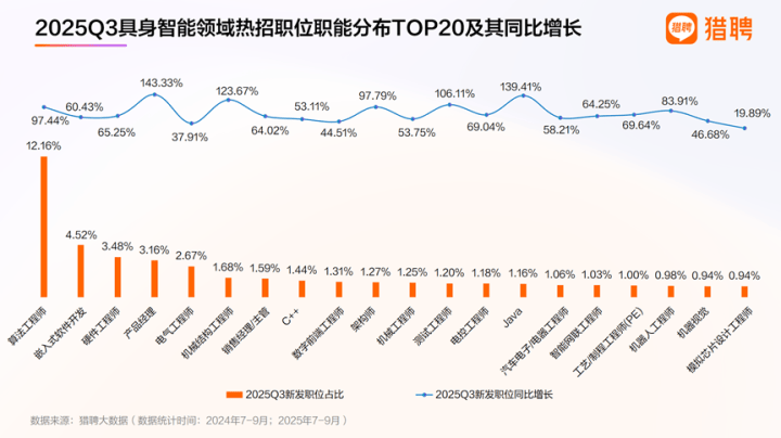 正在具身智能职位的行业分布TOP15中,互联网、机械/设备、人工智能、计较机软件位列前五,形成其四大支柱:硬件之躯(机械/设备)、感官取神经(电子/半导体)、智能大脑(人工智能/软件)取毗连生态(互联网)。从这TOP15行业具身智能职位同比增加来看,整车制制、智能硬件、IT办事、家电行业该类职位三季度增加均超100%。这也意味着,具身智强人才抢夺和曾经从纯互联网和AI公司,扩展到了所有试图通过智能化实现产物升级的保守制制业巨头(如整车厂、家电企业)。从具身智能范畴新发职位的本能机能分布TOP20看,算法工程师、嵌入式软件开辟、硬件工程师、产物司理、电气工程师位列前五。产物司理、Java、机械布局工程师、测试工程师的职位同比增加均超100%,架构师取算法工程师增加均超97%。